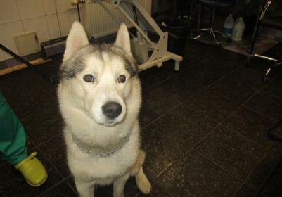 Laimīgais haskija puika ir atgriezās pie sava saimnieka un devies uz mājām.