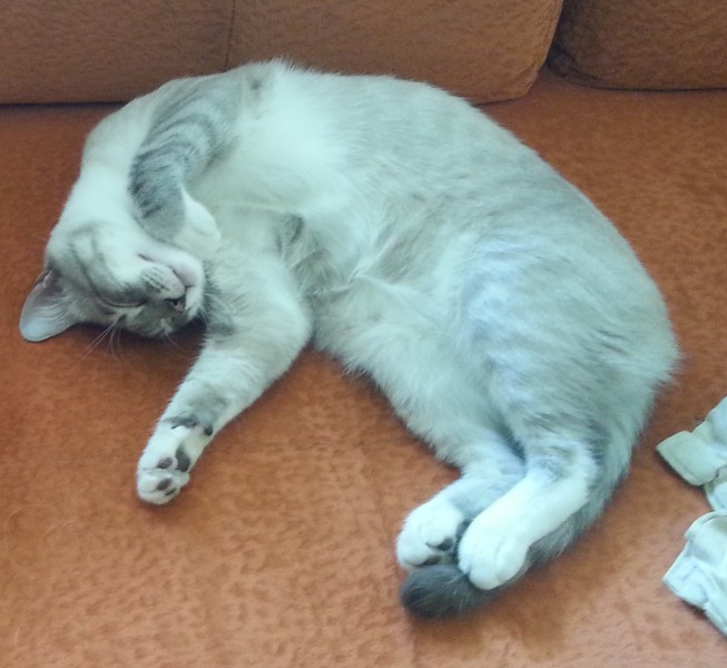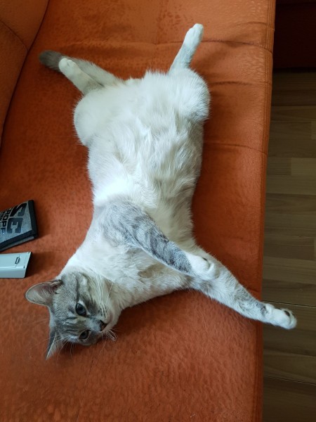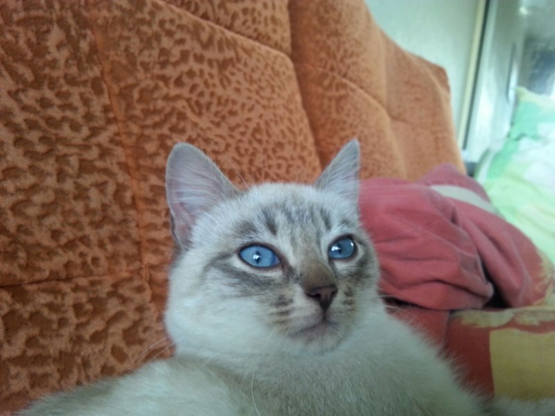 Līdzīgs Birmas kaķim, jo tēvs bijis siāmietis. Zilas acis. No cilvēkiem vairās. Pazudis Sarmas ielas apkārtnē, Jelgavā.