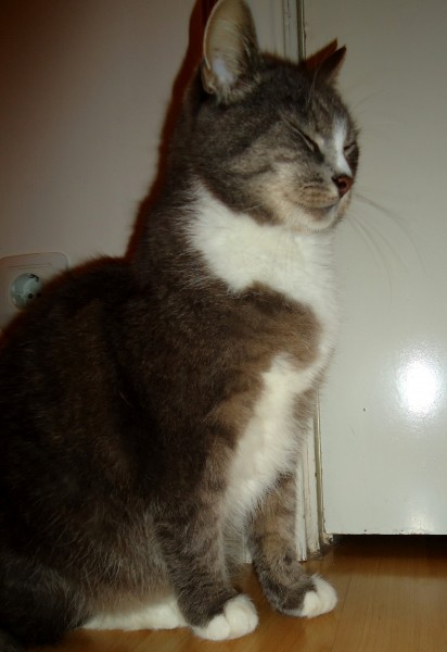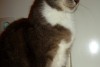 Pazuda kaķis , pelēks, sarkans apkaklis un baltas ķepas.