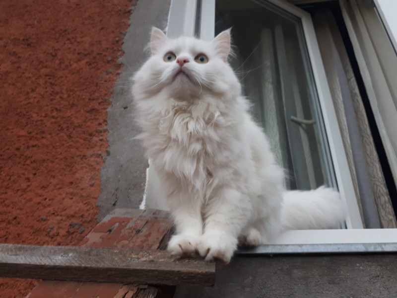 Balta, pūkaina, zaļas acis. Bailīga.