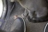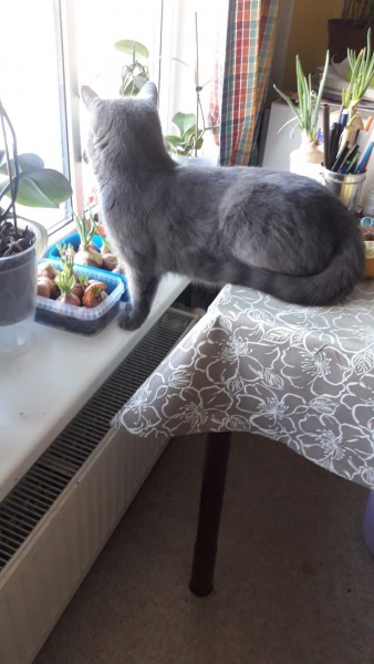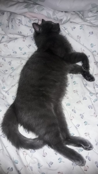 pelēkas krāsas, neliela auguma kaķītis, uz astes nedaudz tumšākas svītras, pakaklē daži balti matiņi, pēc kastrēšanas operācijas aizmucis Smiltenes tehnikuma teritorijā2018.gada 11. aprīlī.