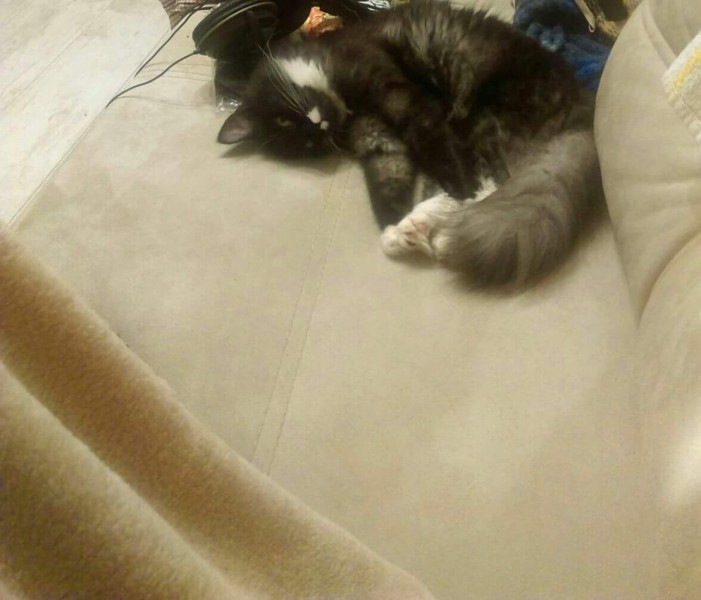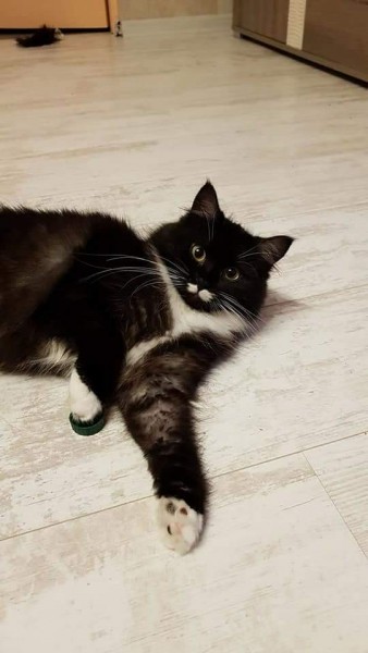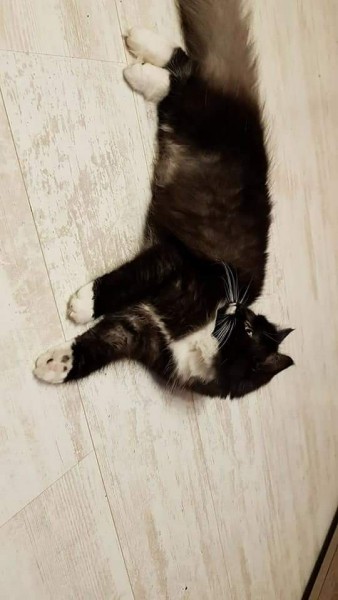 Melna kaķenīte ar baltām ūsām un izteikti kuplu asti. Pie ādiņas spalvas ir pelēkas. Zodiņš un kakls balts. Atsaucas uz vārdu Ēna vai Mazulis.