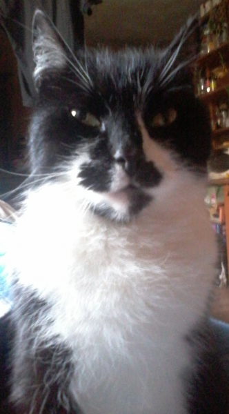 Klasiski melnbalts- melns ar baltām ķepām un krūtežu, raibu purnu, slaids, sācis sirmot. 13 gadus vecs, bet žirgts un veselīgs. Dzīvokļa kaķis, izkļuva ārā pārpratuma dēļ, tādēļ visdrīzāk ir sabijies, slapstās, bet citādi draudzīgs, uzticas clvēkiem.