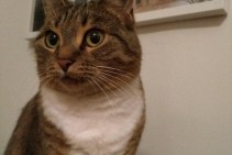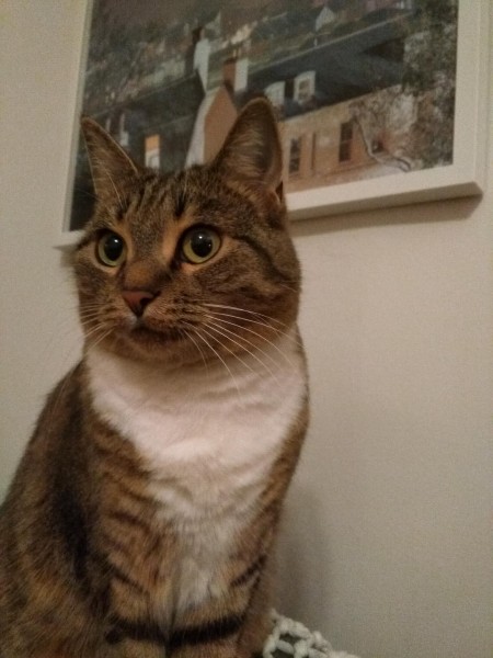 Maza auguma kaķene brūnīgā krāsā ar strīpām. Balta apkaklīte.