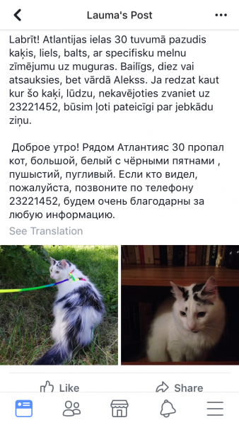 Labrīt! Atlantijas ielas 30 tuvumā pazudis kaķis, liels, balts, ar specifisku melnu zīmējumu uz muguras. Vārdā Alekss. Ja redzat kaut kur šo kaķi, lūdzu, nekavējoties zvaniet uz 23221452, būsim ļoti pateicīgi par jebkādu ziņu.