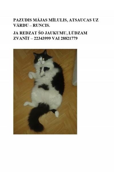 Kaķis ar melnu un baltu spalvu. Kakla siksniņa nav. Rozā deguns un ķepiņas. Atsaucas uz vārdu - Runcis.