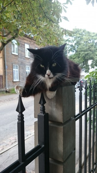 Melns runcītis ar baltām ķepiņām, baltu krādziņu un kuplu asti.