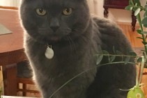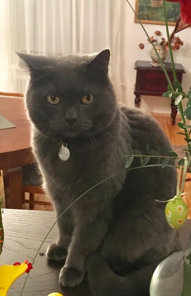 Pelēks,līdzīgs krievu zilajam.Kaklā medaljons ar vārdu un telefonu.
