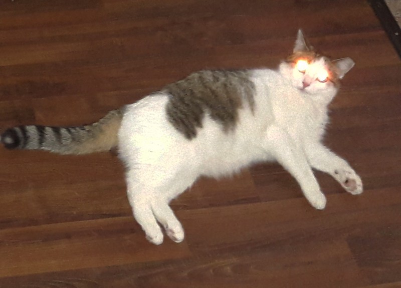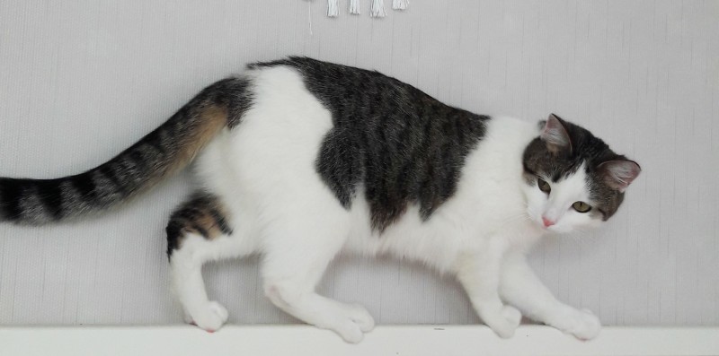 Mājas kaķis. Smalkas miesasbūves kaķene. Īpašas iezīmes - Nav kreisās auss galiņš, pats astes galiņš ir balts.