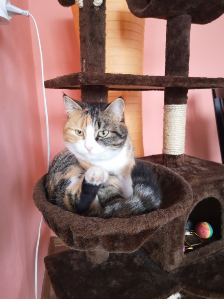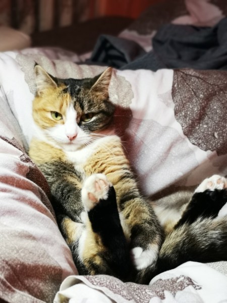 Gaiša trīskrāsaina kaķenīte. Purniņa kreisā puse rūsganā krāsā.