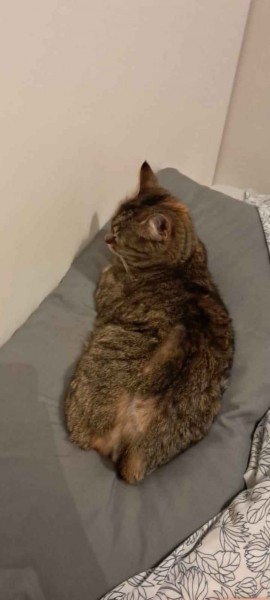 Pelēkbrūni strīpaina kaķenīte, ļoti bailīga, bet arī ļoti mīļa. Ap kaklu zaļa pretērču siksniņa, uz muguras un pie astes, pleķīši, kur neaug spalva, jo apakšā senas rētas. Pati prom no teritorijas nekad nav gājusi, bet tajā dienā sētā tika svešs suns