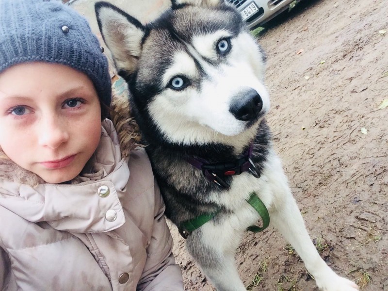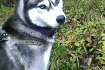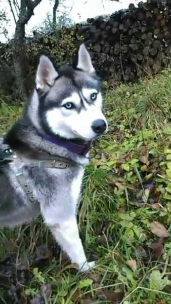 Pelèka ar baltu ,zilám acīm,ap kaklu lillá rukka kaklasiksniņa