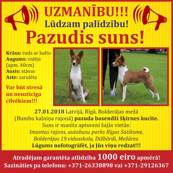 27.01.2018 pazuda besendži šķirnes kucīte, krāsa ruds ar balto!!! Joprojām meklējam! Ir manīta Imantā, Iļģuciemā...