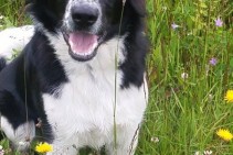 Mugura melna, aste balta, augšā, ausis nokarenas. Krūtis, vēders, kājas baltas, uz kājām melni punkti. Suns čipēts, reģistrēts.