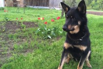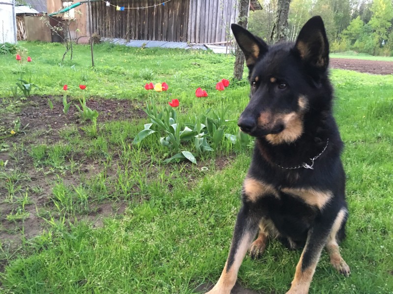 Pazudis melns vācu aitu suns ar brūniem akcentiem. Draudzīgs pret cilvēkiem.