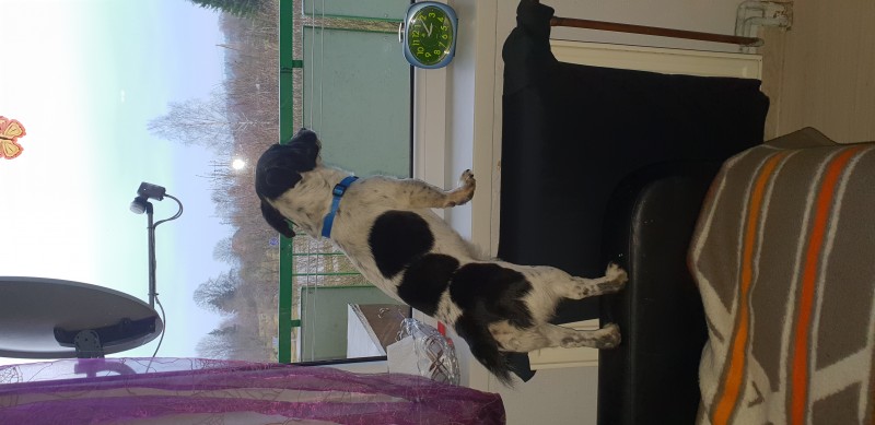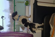 Balts ar melniem plankumiem.Ap kaklu bija zila siksniņa.Astīte nogriezta-īsa.Atsaucas uz vārdu-Garis.