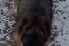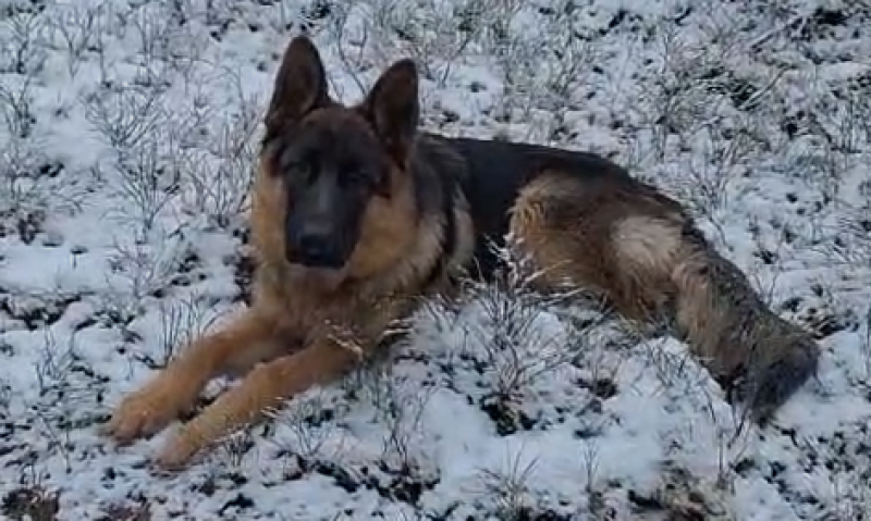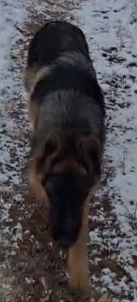 Vācu aitu ganu suns, tēviņš. Bez kakla siksnas bet ar čipu. Melns purns, sudrabaina spalva uz skausta.