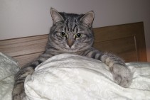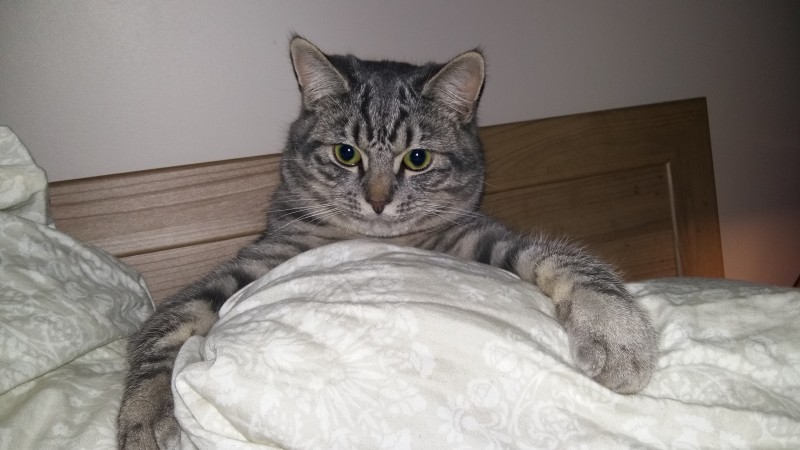 Pelēks, ar gaišām svīrtām. Zila kaklasiksna. Atsaucas uz vārdu Kirils.