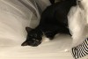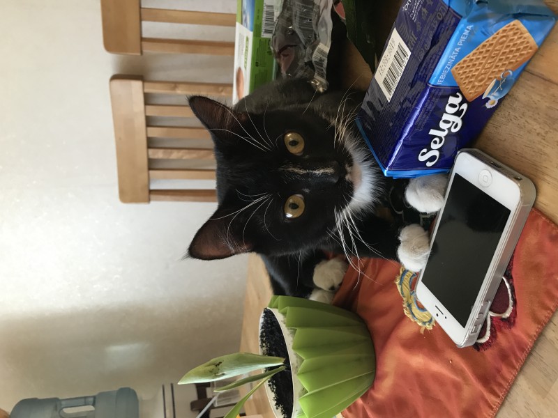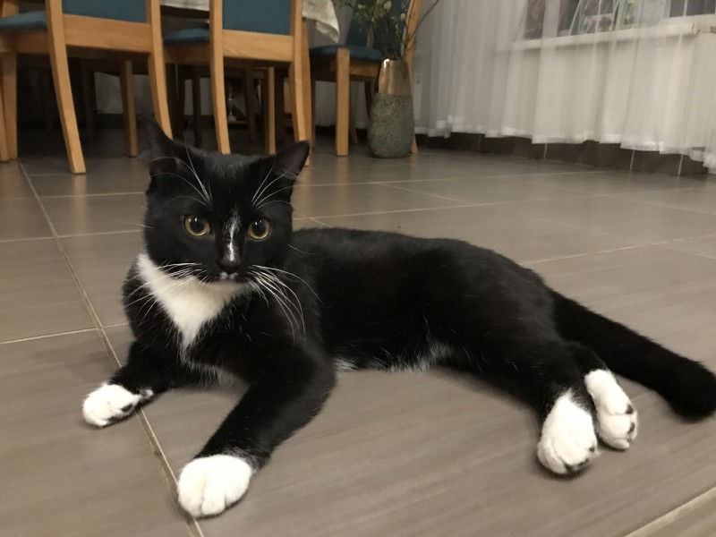 Melns kaķis ar veselīgu spalvu, baltām ķepiņām, vēderu un ūsām. Dzeltenīgas/brūnas actiņas. Ļoti aktīvs, patīk spēlēties un ķert.