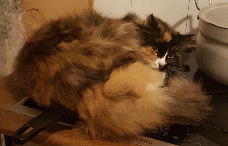 Trīskrāsaina kaķene. Bija dzeltena pret blusām kakla siksna. Kaķenei ir 13 gadi. Kaķene ir sterilizēta. Pēc rakstura kaķene esot ļoti bailīga, mežonīga.