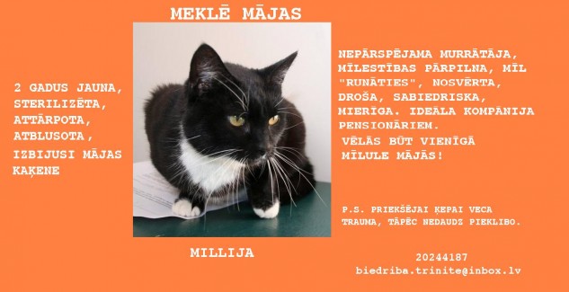 Millija adoptēta. Tagad dzīvo Āgenskalnā! :) Paldies visiem par ieteikumiem!