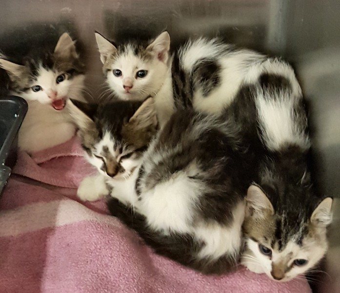 apmēram 2 mēnešus jaunās četras balti - pelēki - melni izzīmētās mincītes ( būs ar kuplu kažociņu) nākušas no Palīdzības ielas 1, Jelgavā. 2 vēl gaida iespēju nokļūt jaunās mājās.