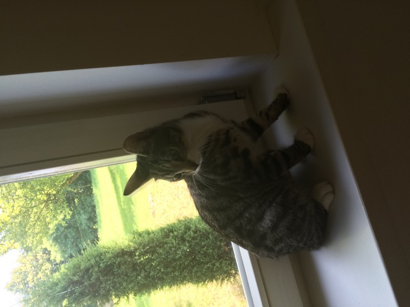 Mazs, strīpainu kažoku, viena no pakaļkājām ar lielu baltu pēdu pretstatā pārējām kājām. Nav kastrēts, 6 mēnešus vecs.