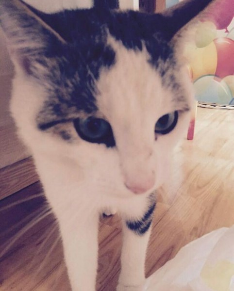 Vairākkrāsu kaķis. Neliela auguma, nav apaļīgs. Gaišs purniņš. Mīlīgs.