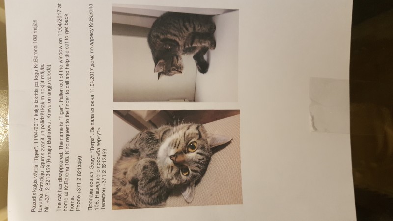 Pazudis kaķis, kas izkritis ārā pa logu. Iespējamas traumas. Atsaucas uz vārdu Tigers.