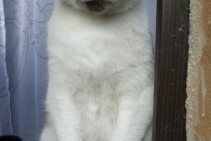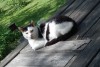 Kaķis ir balts ar melnu. Atsaucas uz vārdu Miks.