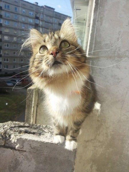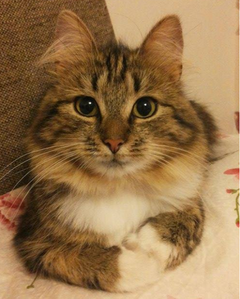 Kaķenīte ar baltām ķepām un krūtiņu, ar lielām ūsīm, no ausīm aug spalvas, atsaucās uz vārdu Sofa.