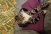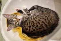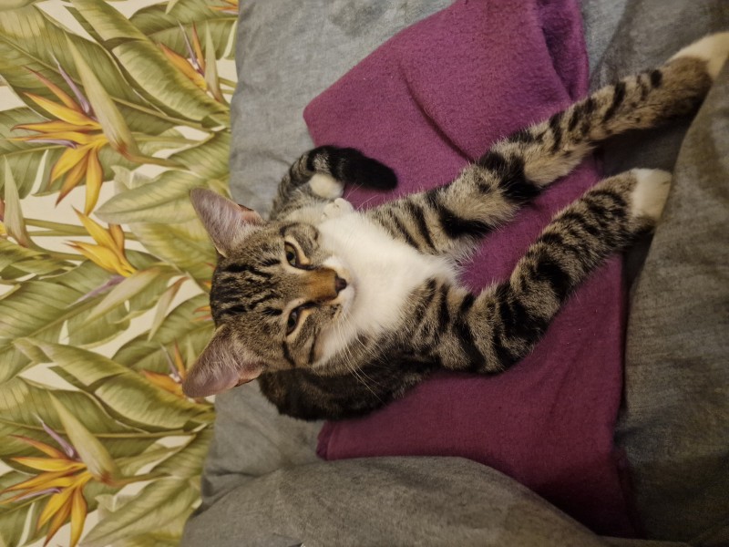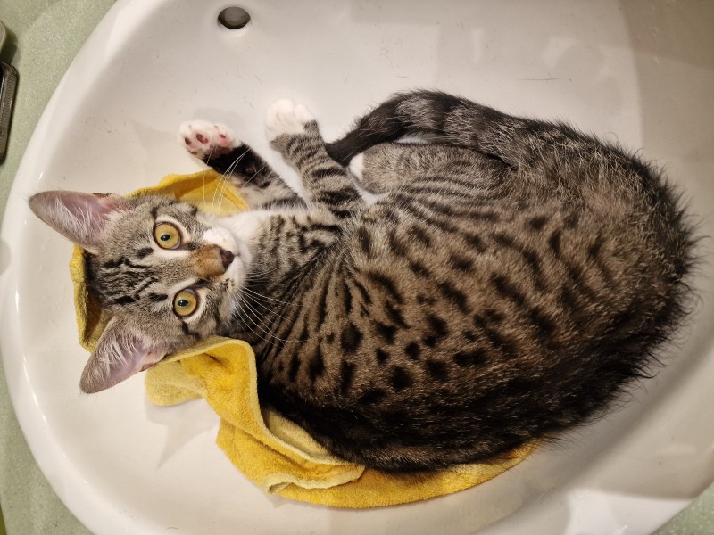 Pelēkā psmatkrāsā ar melnām svītrām, baltām ķepiņām un kakliņu.