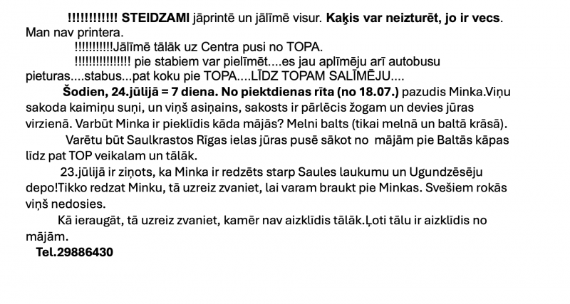 No 18.07.pazudis Minka.Viņu sakoda kaimiņu suņi.Viņš asiņains, sakosts ir pārlēcis žogam un devies jūras virzienā- Rīgas ielas jūras pusē sākot no mājām pie Baltās kāpas līdz pat TOP veikalam un tālāk.Redzēts starp Saules laukumu un Ugundzēsēju depo.