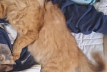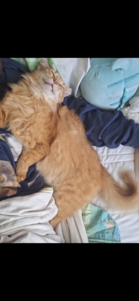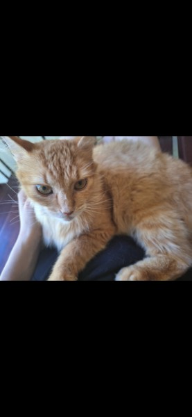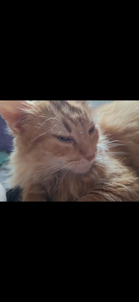Ruds, pūkains, maza auguma kaķis. Labās auss galiņš nogriezts. Kaķim aste liecas uz augšu gredzenā.