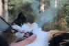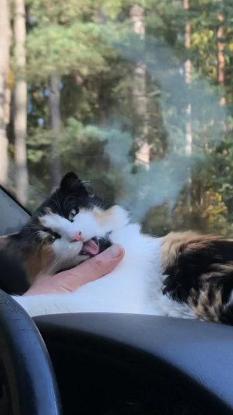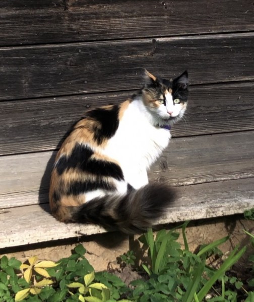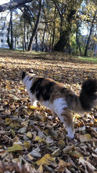 Ļoti pūkaina aste. Kājas un vēders-balti. Mugura, aste un galva-trikolor. Atsaucās uz vārdu Sāha un svilpošanu.