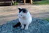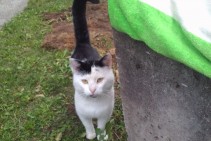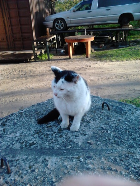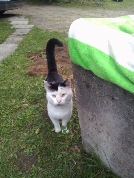 Balts ar melniem pleķiem un melnu asti tikko kastrēts. Billdē ir veca tagad var būt netīrs un resns. Var būt ielīdis jūsu pagrabā vai šķūnī lūdzu pārbaudīt.Mēs viņu gaidam mājās.