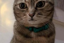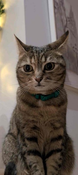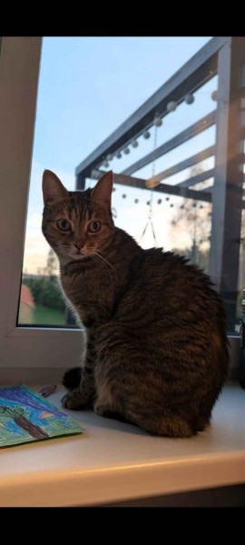 Pelēkbrūni strīpaina kaķenīte, ļoti bailīga, bet arī ļoti mīļa. Ap kaklu zaļa pretērču siksniņa, uz muguras un pie astes, pleķīši, kur neaug spalva, jo apakšā senas rētas. Pati prom no teritorijas nekad nav gājusi, bet tajā dienā sētā tika svešs suns