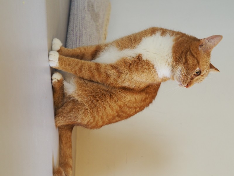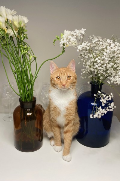 Rižs, baltas ķepiņas un vēders. Oranžas acis, rozā deguntiņš.