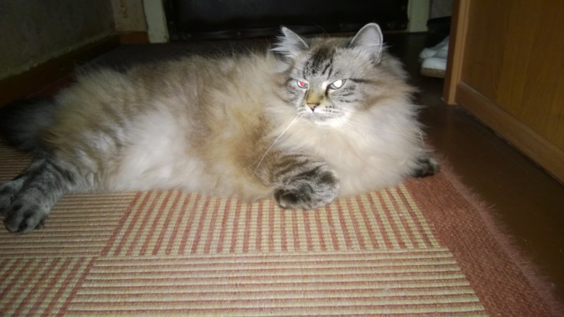 Izkritusi no otrā stāva balkona kaķenīte.Pelēka kupla spalva tumša aste, acis zilas.Var atsukties uz vārdu Kitija.Ir tieksme nolīst pagrabos pēc bēgšanas.