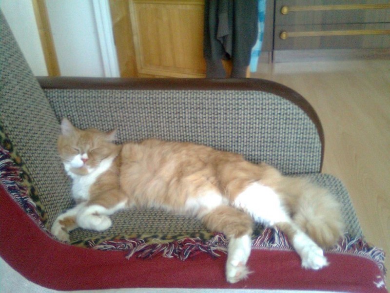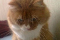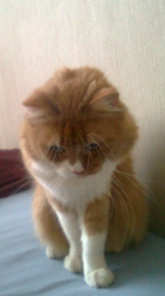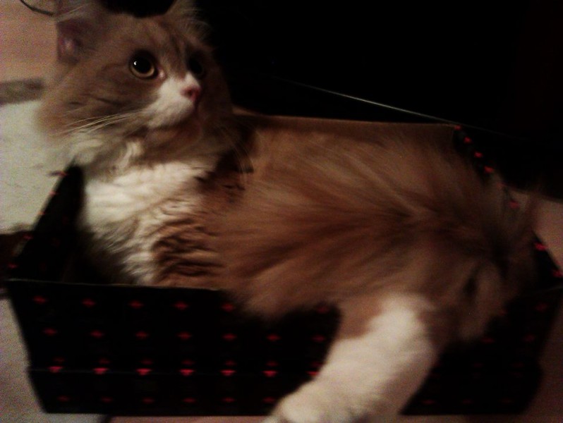 Kaķis ir ruds, ar baltām ķepiņām, purniņu un apkaklīti, garu spalvu, atsaucās uz vārdu Dzintars vai Dzindzis.