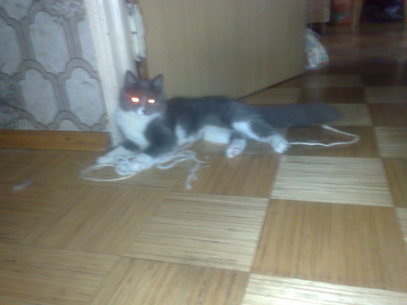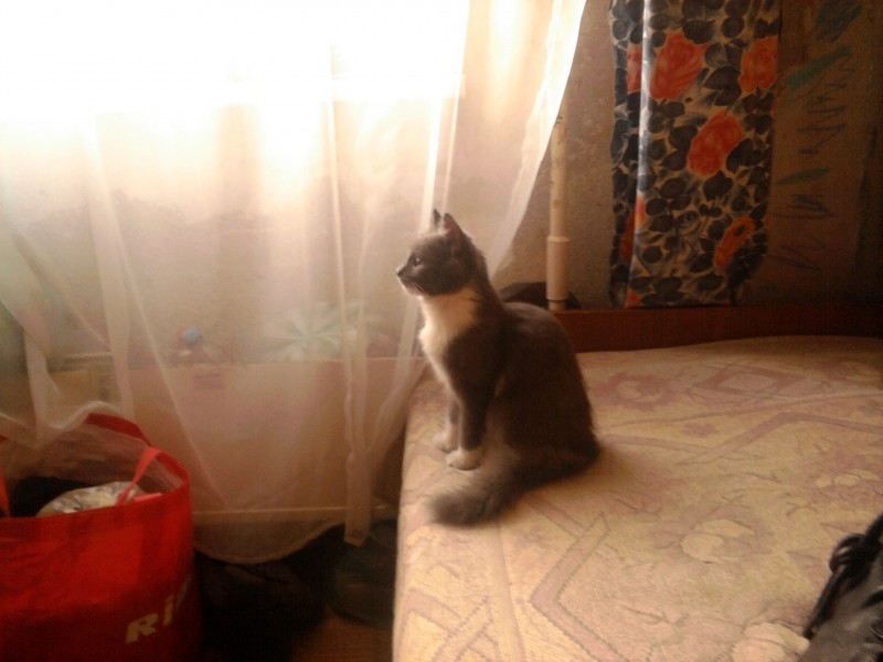 Sudrab-pēlēka kaķene ar balto krūtiņu,baltam ķepam un balto svītriņu purnī,acis zaļi-oranžas,ļoti pūkaina,sauc Dimka(Дымка)