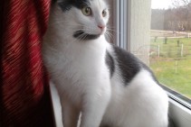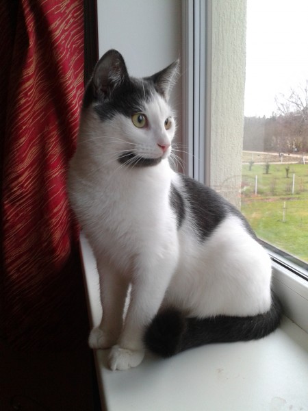 Pelēk-balts kaķis. Pelēks zodiņš, kas izskatās kā bārda.