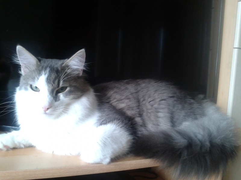 Peleks ar baltam kepam un vederu ,un nebaudz baltu sejinu.apkart vinaj acij ir peleks otraj balts.ļoti pukajna aste un diezgan liela izmera pats.