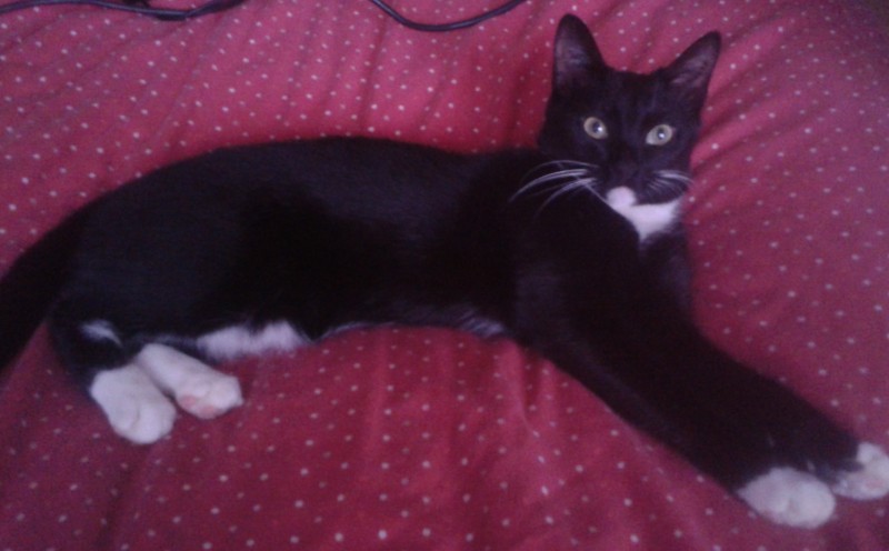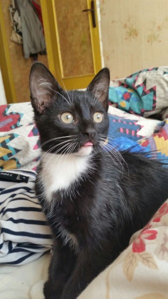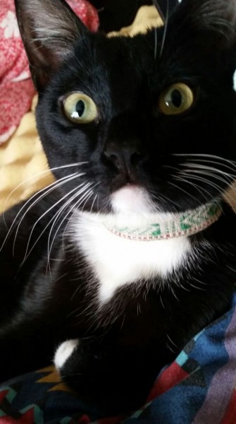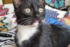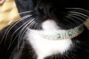 PAZUDUSI KAĶENĪTE. MELNA AR BALTĀM ĶEPĀM UN KAKLIŅU, ATSAUCAS UZ VĀRDU MINI. VIŅAI IR LATVIEŠU RAKSTA SIKSNIŅA, ZAĻA AR BALTU.