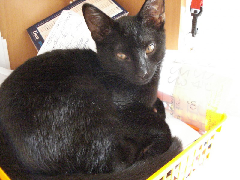 Pazudis 11 mēnešus vecs pilnīgi melns (viscaur, bez plankumiem) runčuks ar dzeltenām acīm, melnām ūsām. Atsaucas uz vārdu "Ezis". Spalva gluda, īsa. Lielas ausis. Labi zina savu vārdu.