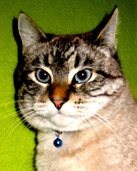 Kaķis ir Balts ar bēšīgām, pelēkām un melnām strīpām, zilas acis un zila siksniņa ap kaklu.