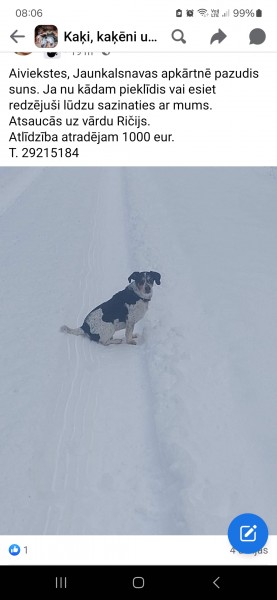 Aiviekstes, Jaunkalsnavas apkārtnē pazudis suns. Ja nu kādam pieklīdis vai esiet redzējuši lūdzu sazinaties ar mums. Atsaucās uz vārdu Ričijs.