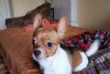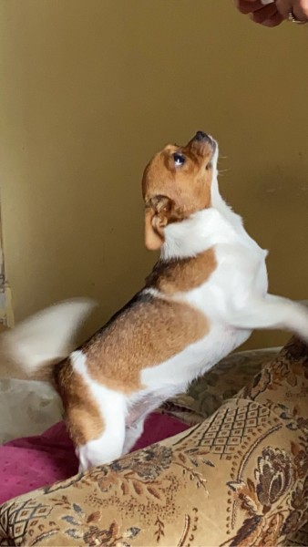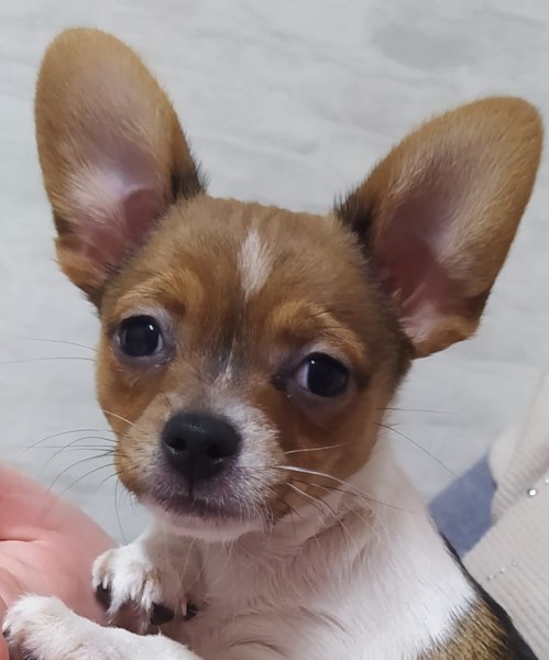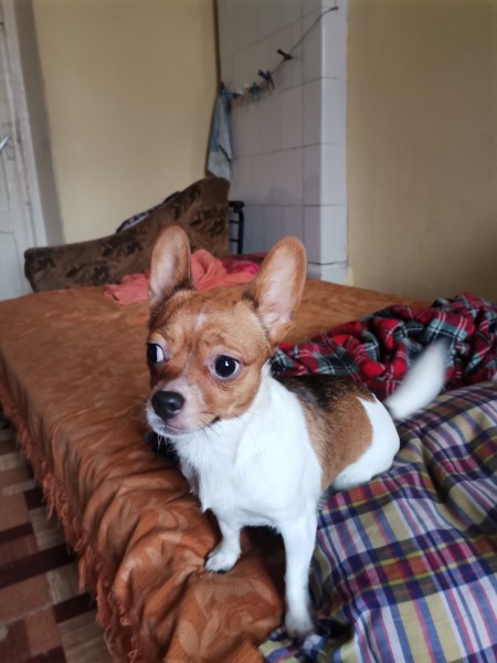 Ļoti maza augumam, čiuaua (čiava) krustojuma meitenīte - balta ar brūniem plankumiem. Bailīgi dodas svešiniekiem rokās. Atlīdzība garantēta