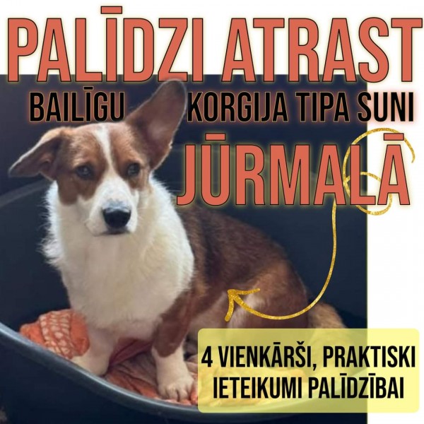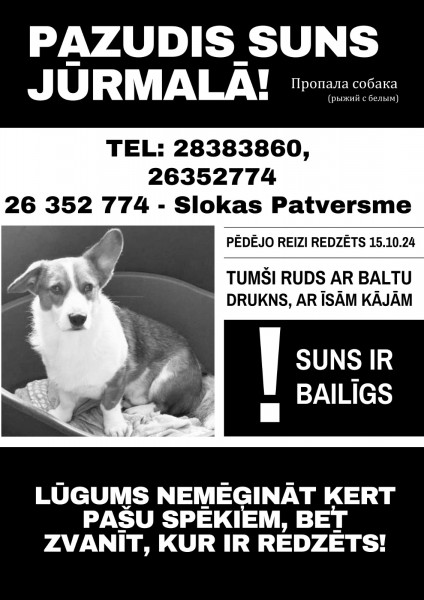29.09.2024. aizbēga no Slokas patversmes pastaigas laikā. Paniski baidās no cilvēkiem. Neķert, bet zvanīt nekavējoties.