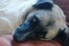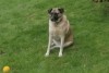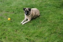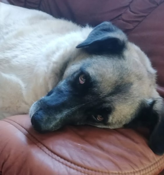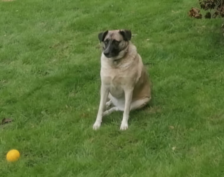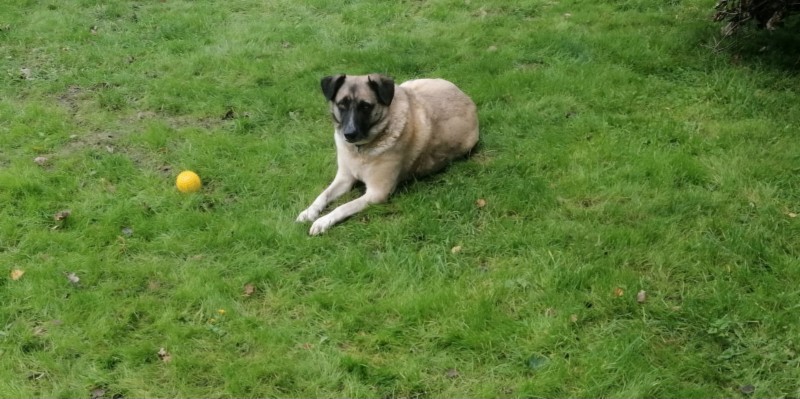 Gaišas spalvas suns ar tumšām ausīm un purnu. Uz kakla siksnas žetons kauliņa formā ar suņa vārdu- Lotte. Nav agresīva.
